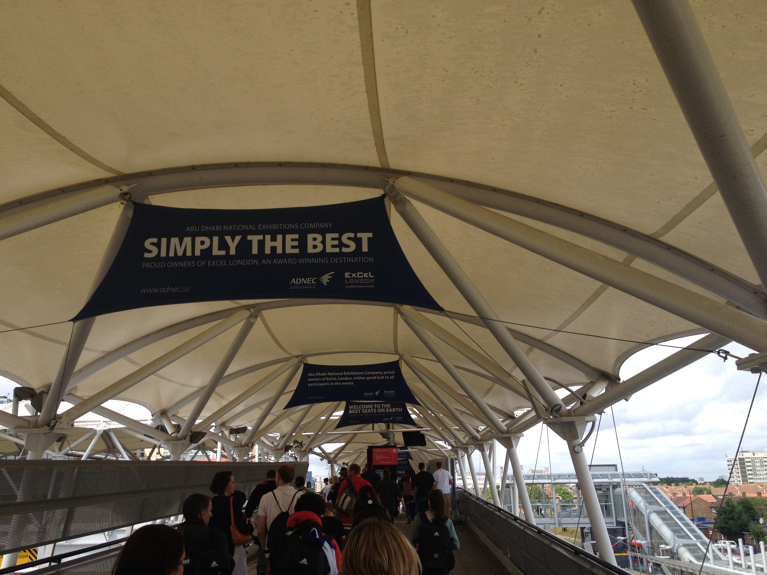 Custom House stationVery jolly and friendly security checks got us into the ExCel. We walked its length and breadth and soaked up the atmosphere, which really was rather splendid. Not only does it house the Boxing, but also Judo, Weightlifting, Table Tennis, Fencing, Wrestling and Taekwondo. As our sports session was from 1.30 to 3.30pm, we thought we’d have a light lunch at one of the stalls. Again this involved the usual gluten-free hunt, but that was quite easily achieved by the appearance of a large and tasty looking Jacket Potato stall, so both Mrs C and I had a Jacket Spud with cheese and beans (£5.50 each) and some water. We sat on the floor, ate, drank and were merry.