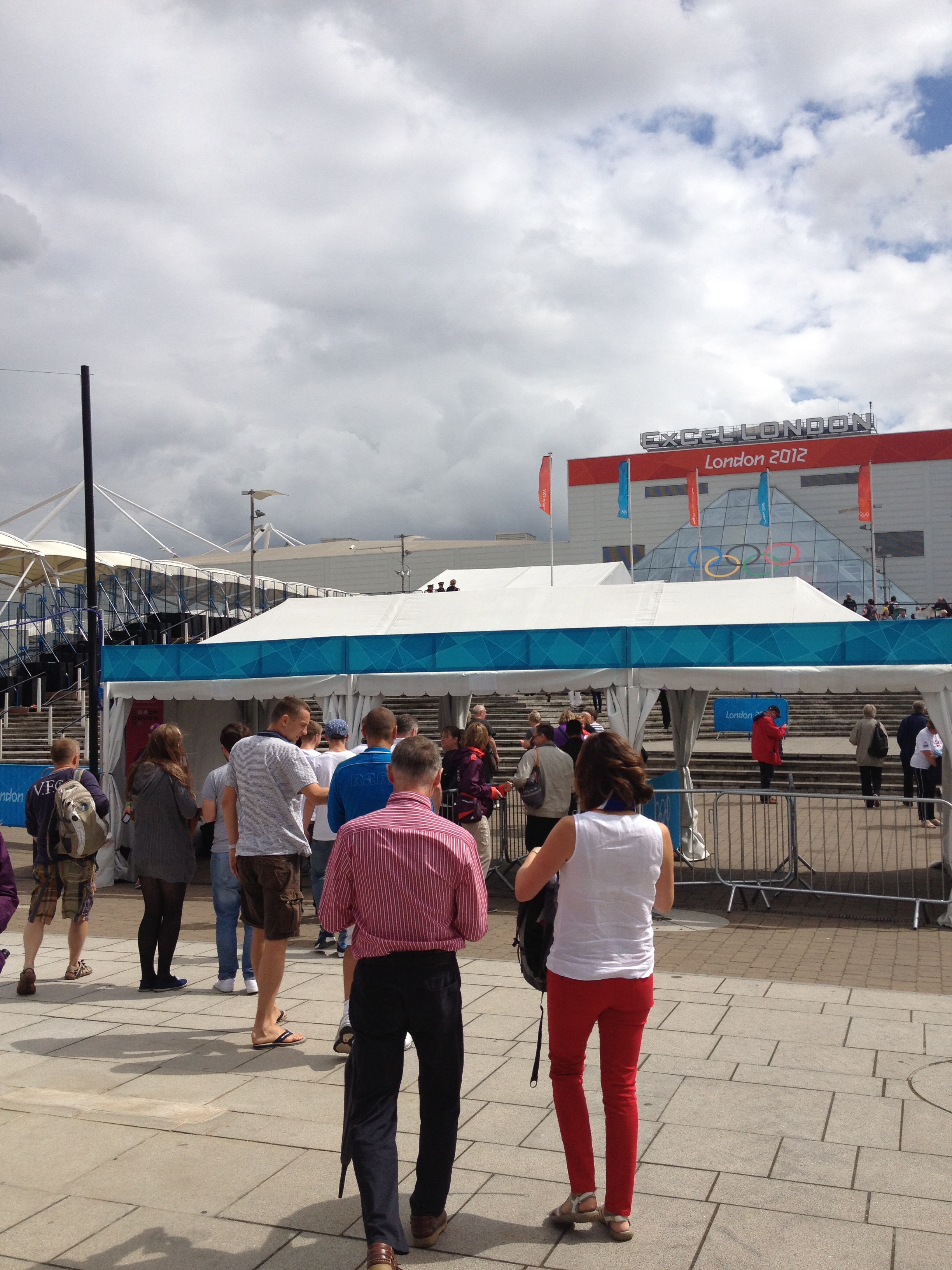 A quick check of my Tube Map App recommended the Northern Line from Euston to Bank then DLR to Custom House. Quite easy – approximately 33 minutes. When we arrived at Euston, however, the recommended Olympic route, on all the information boards, was Victoria Line to Kings Cross, then Circle Line to Liverpool Street, walk to the mainline station, take the Overground to Stratford, walk 6 minutes to Stratford DLR, and from there head to Custom House – 1 hour 8 minutes. Or alternatively, with one fewer change, (but three minutes longer), tube it to Highbury and Islington, then take the overground to Stratford. Why all the fuss? We just went to Bank, changed nice and simply to the DLR and arrived at Custom House station long before we needed to, so much so that we stopped off for a decent cuppa tea at a bar adjacent to the station, which was awash with accredited people from all nations of the world.