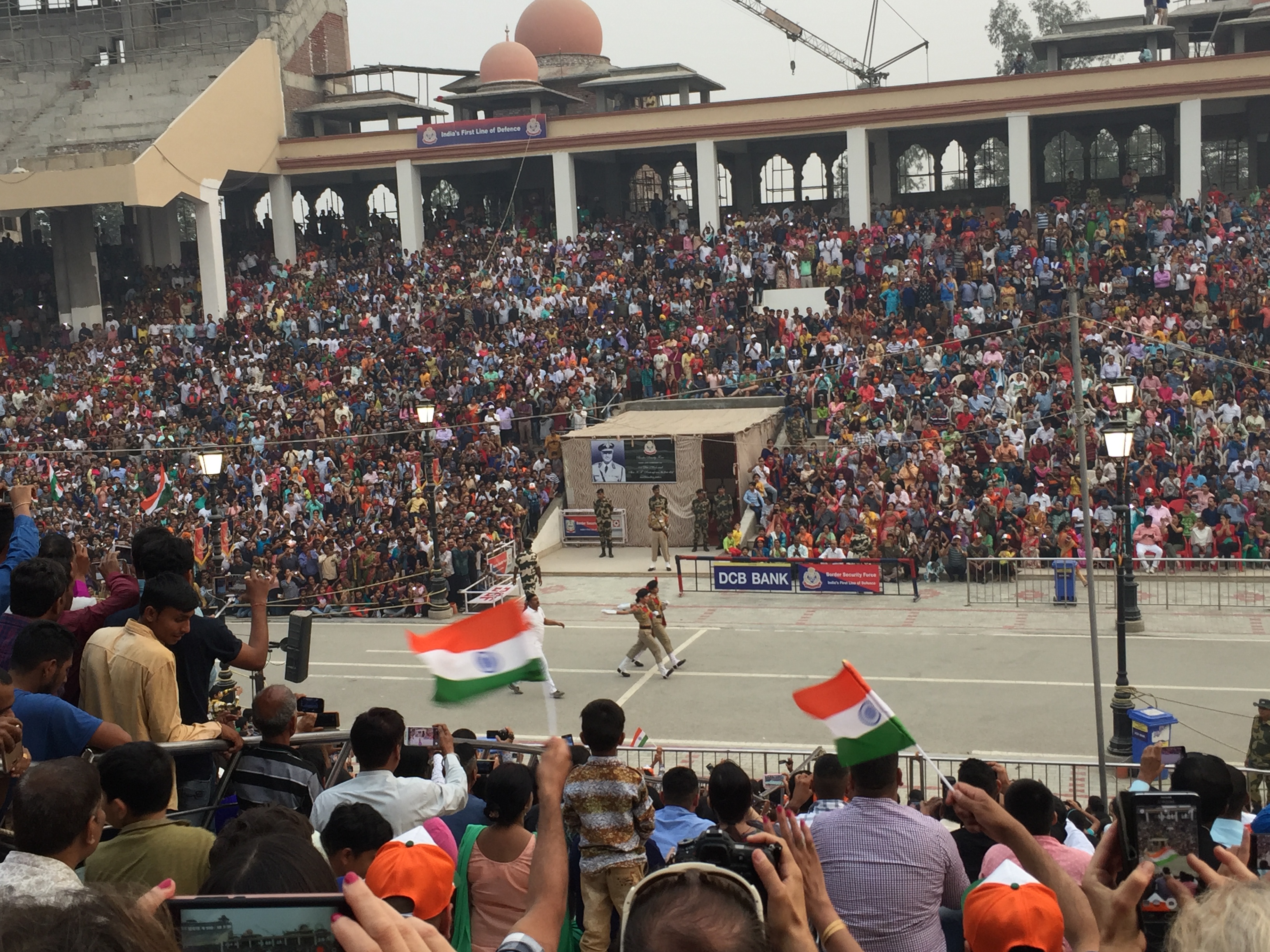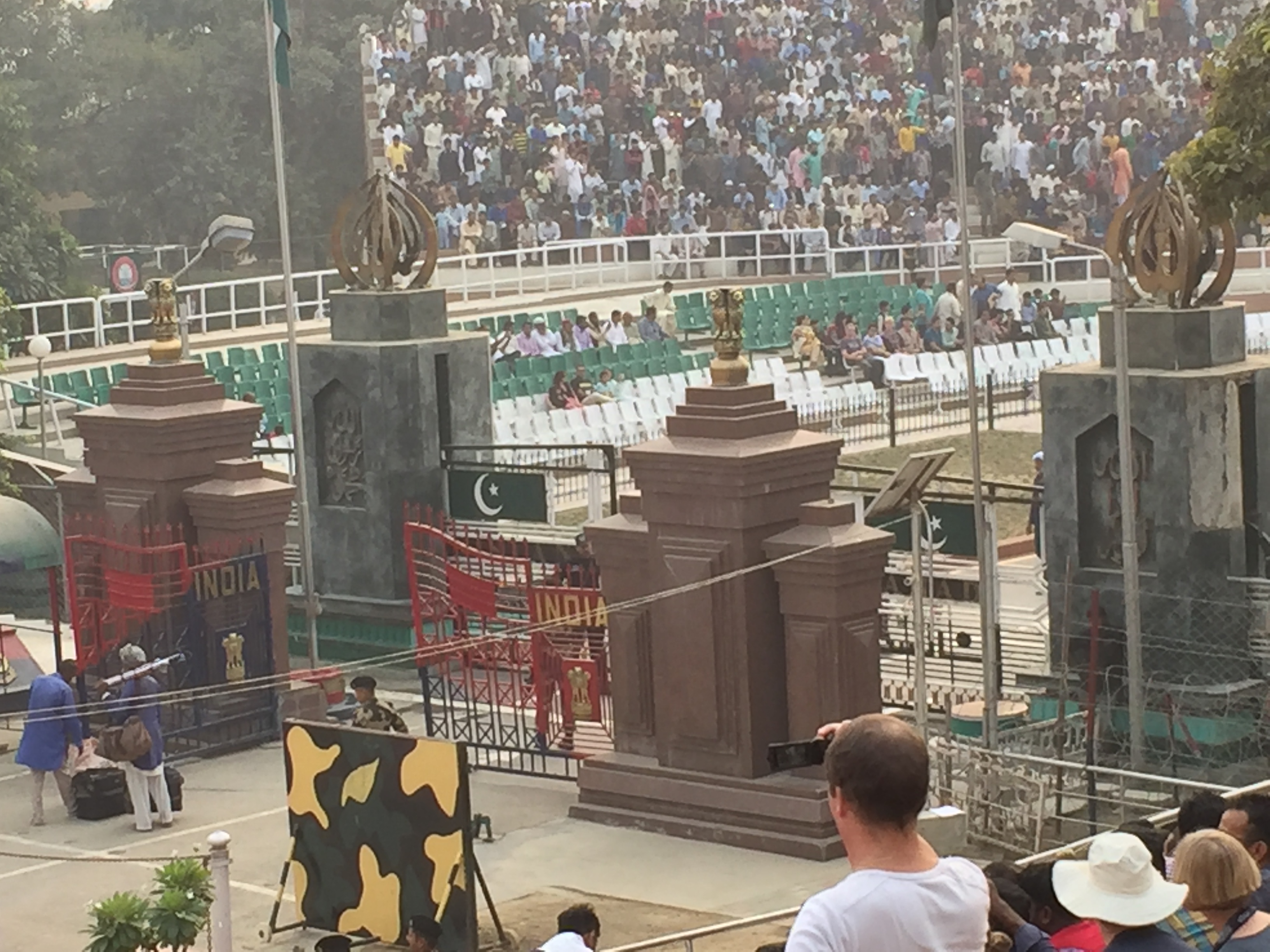 But you have to accept the high security, it’s to everyone’s advantage. Eventually you get to the border – and you really are right on the edge of the country. Take your seat and watch what happens. In front of you and to your left, you see all the people on the Indian side amassing, their Indian flags painted on their faces; whistle-happy Indian soldiers trying to marshal people into position and then make them stay there; loud, unintelligible public announcements on the public address system;