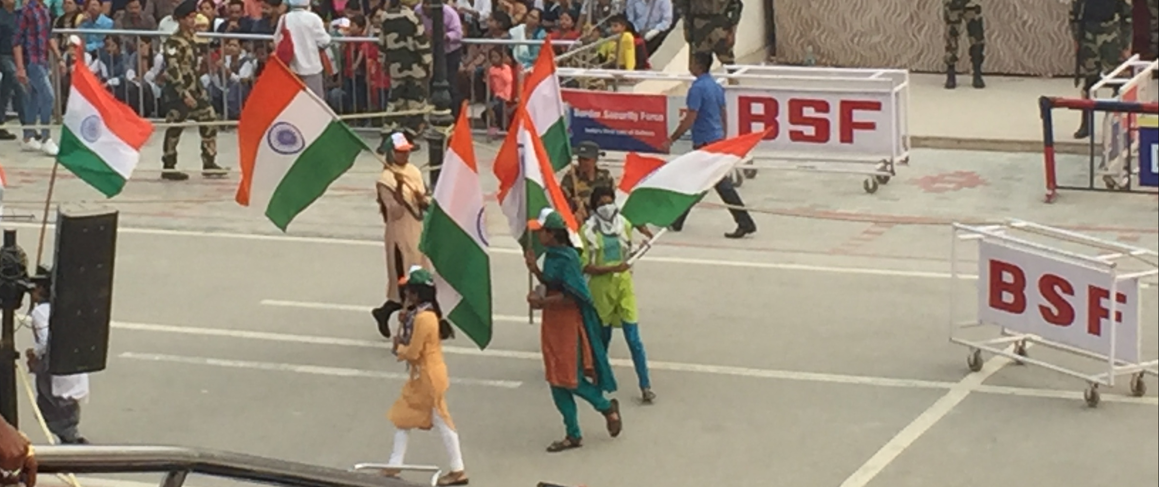 whilst the soldiers (lamely) fend them off and invite them back to their seats. It’s all part of the ceremony though; if anyone did anything really out of order, I’m sure they’d know about it. Next, Indian women soldiers start to march towards the border, to the enormous cheers of the crowd, and no Pakistani women soldiers to greet them.