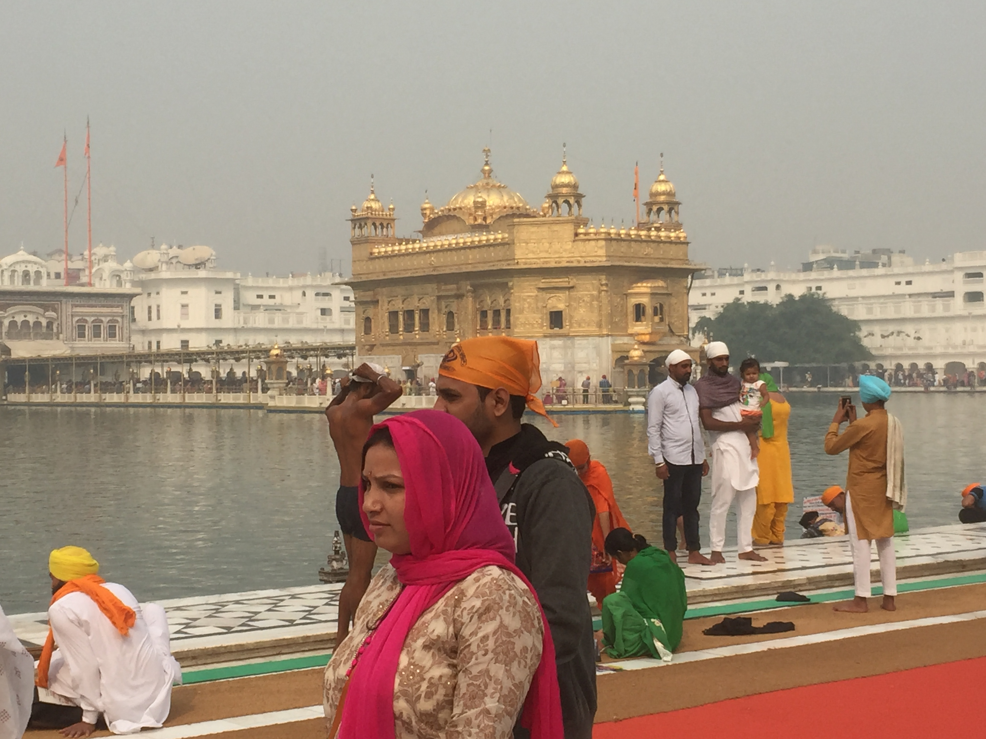 Continuing along the road towards the Golden Temple, the crowds begin to get thicker and more animated. Eventually the front wall of the complex looms up like a ghostly cake made of icing sugar. Crossing the marble entrance square, John went to secure our tickets whilst we removed our shoes and made sure our heads were covered with the complimentary orange scarves. He announced that there were probably going to be more than 200,000 visitors