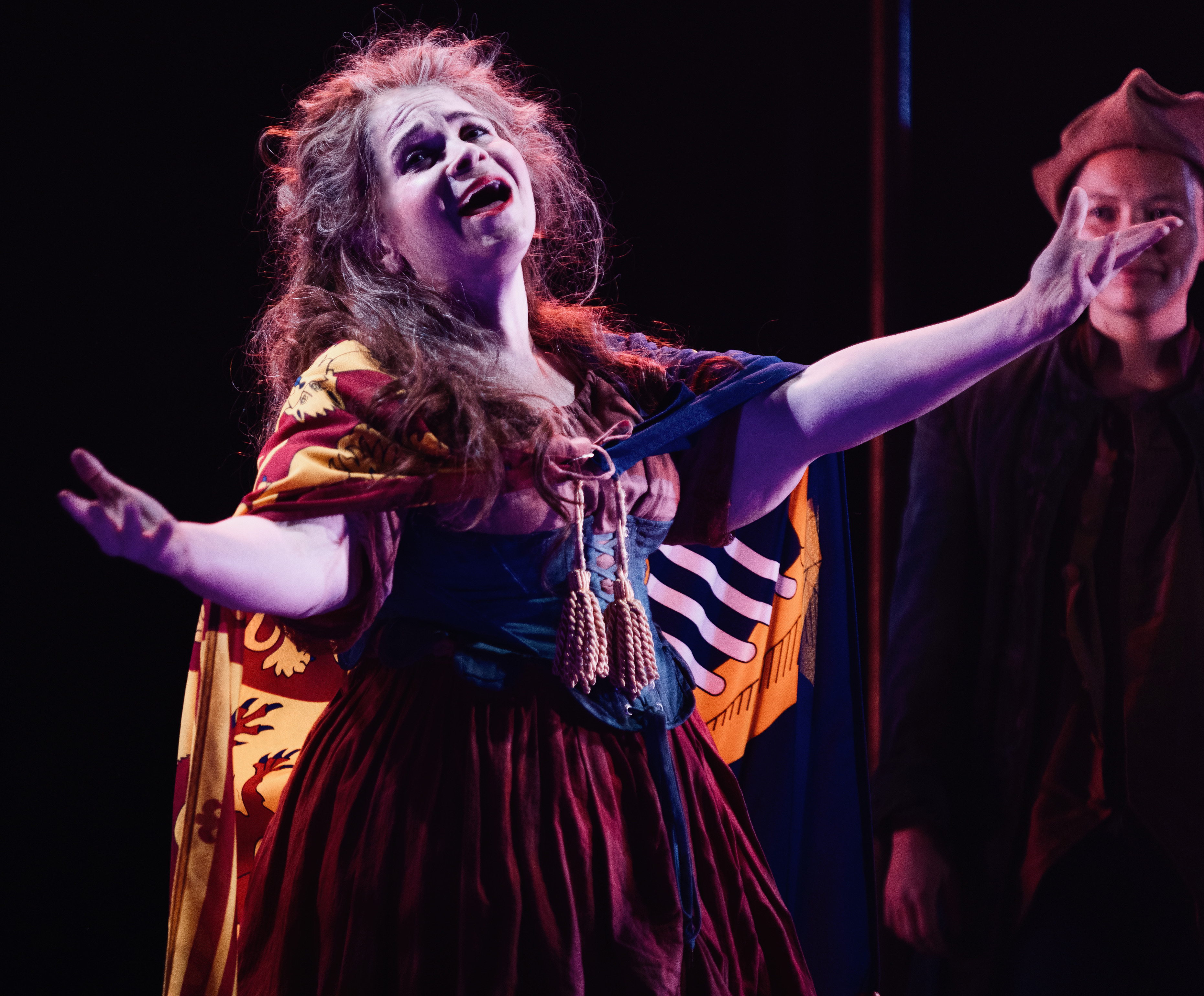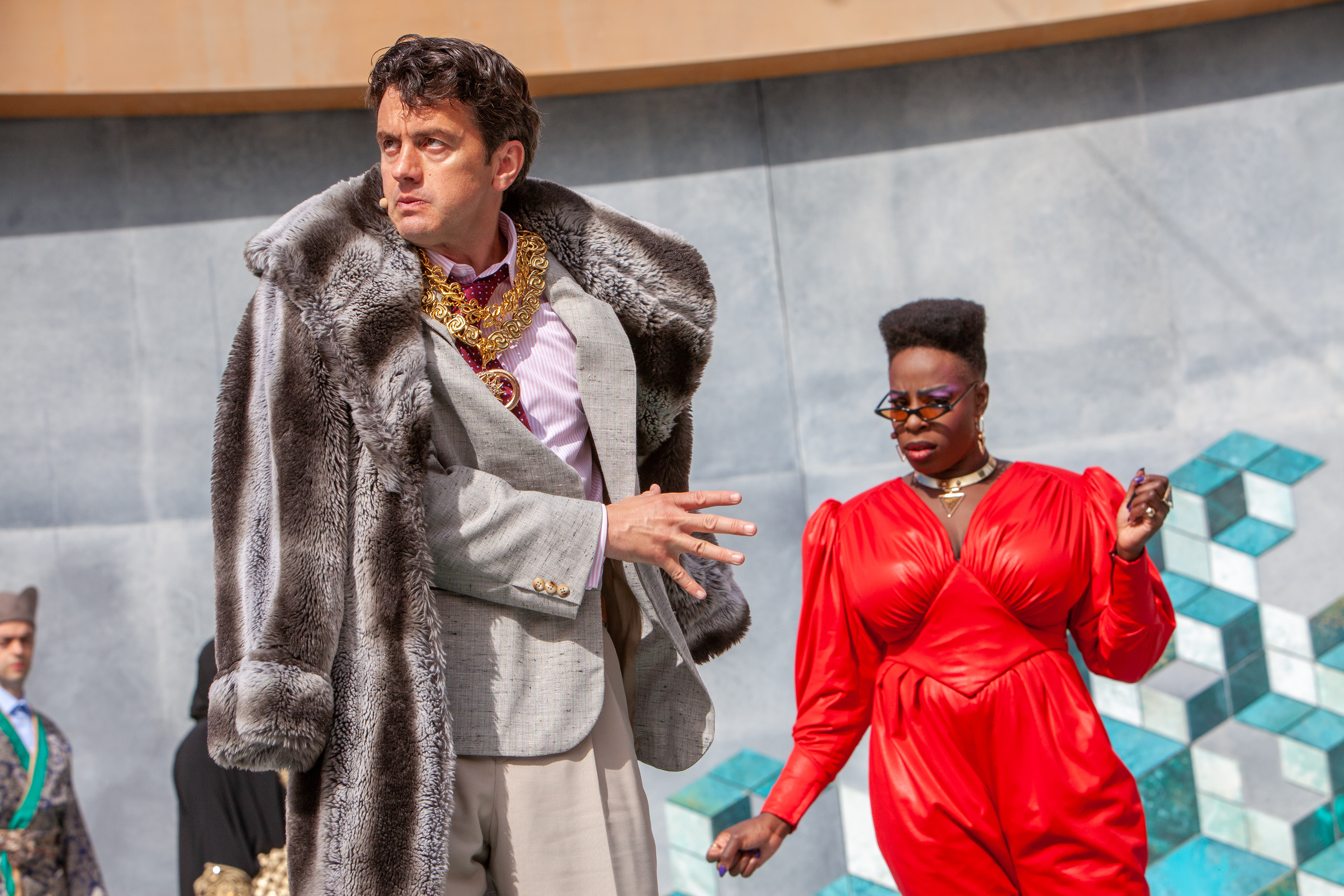 There’s an extremely funny and vivacious performance by Baker Mukasa as the perplexed goldsmith Angelo, trying to balance his debtor and creditor with beaming but unsuccessful interpersonal skills until the money just isn’t there; I loved Alfred Clay’s Doctor Pinch, portrayed as a yogic charlatan in posing gold lamé; and Toyin Alyedun-Alase’s wonderful Courtesan creates a very striking figure as an almost-dominatrix, alluring and threatening at the same time – you wouldn’t want to cross her. William Grint breathes new life into the character of the gangster second merchant with some fantastic physical comedy, and together with his bodyguard Dyfrig Morris, show how disability can be a positive force on stage. Riad Richie, Patrick Osborne and, audience’s favourite, Sarah Seggari, all bring terrific comic support to their variety of roles.