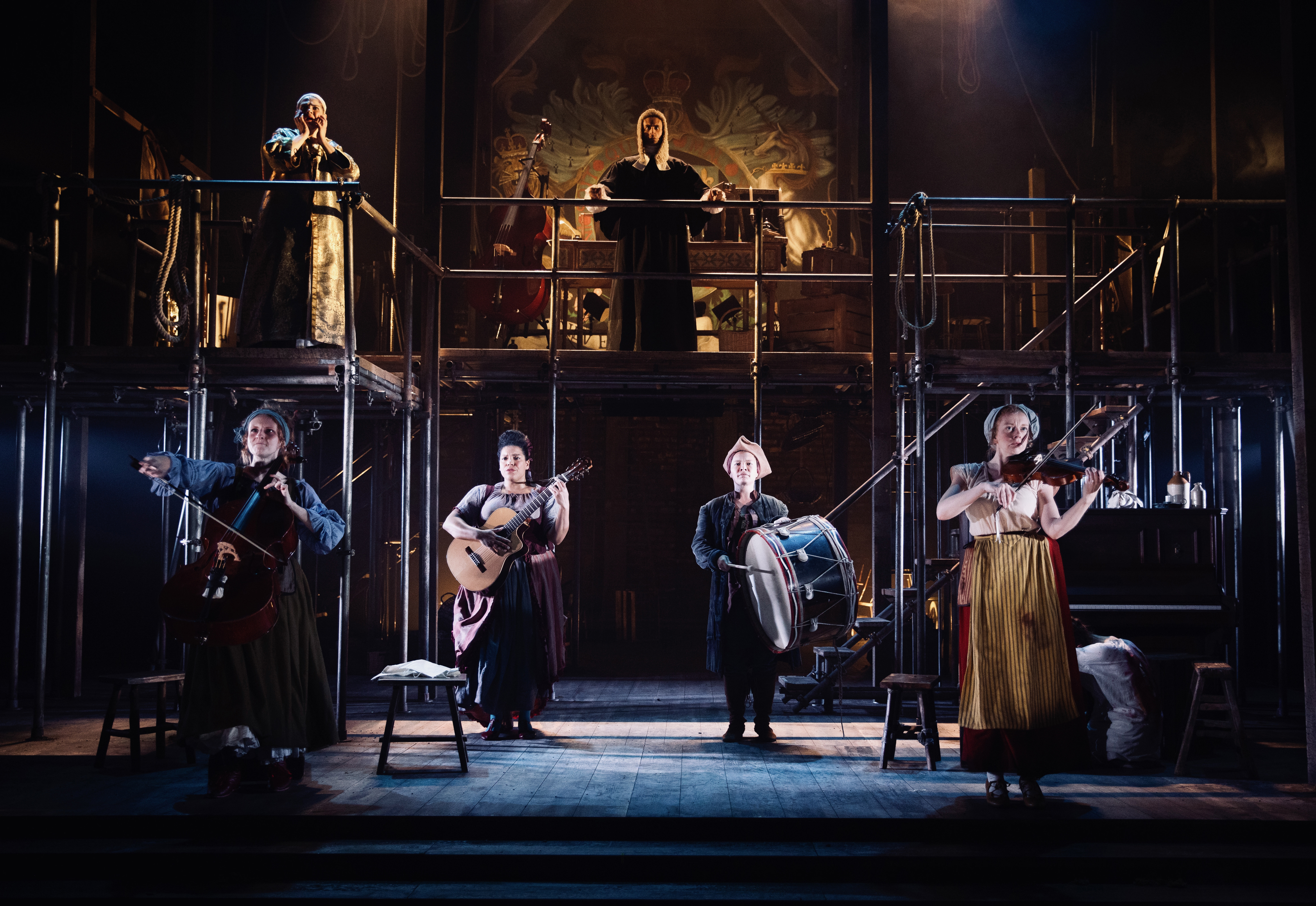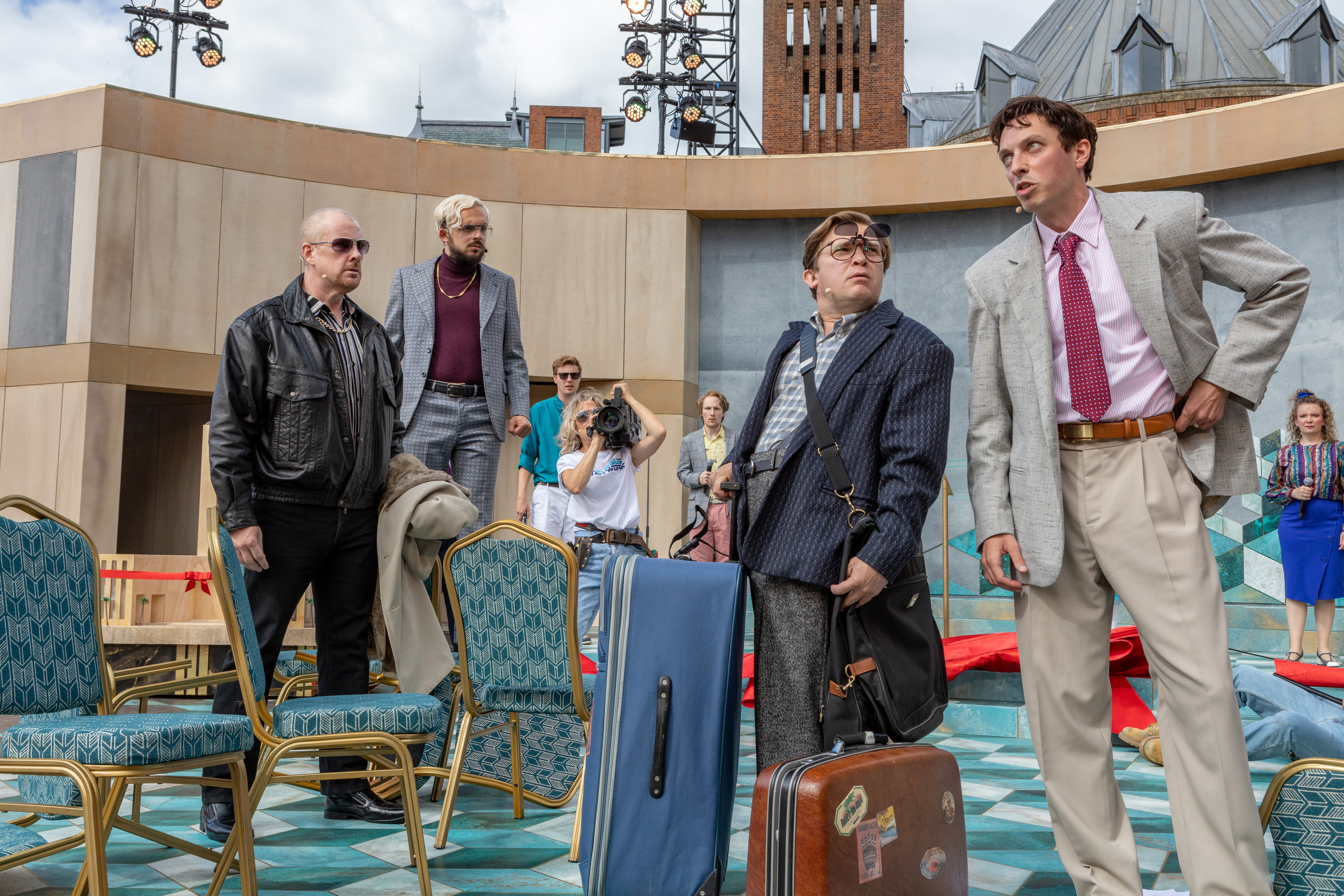 Max Jones has created a simple but extremely effective set, with a tiled floor that recreates both cobbled streets and wealthy flooring, plus a back wall that parts in the middle to suggest the all-important abbey where the Syracusan Antipholus and Dromio take refuge. Dyfan Jones’ sound design is superb; in particular, the comic scene between A of S and D of S, about the countries embedded in the realms of Luce’s body, works incredibly well with the sound tricks played by the imaginary microphones. One reservation though; at times, the sound of the four beatboxing vocalists became slightly overpowering. More of them later.