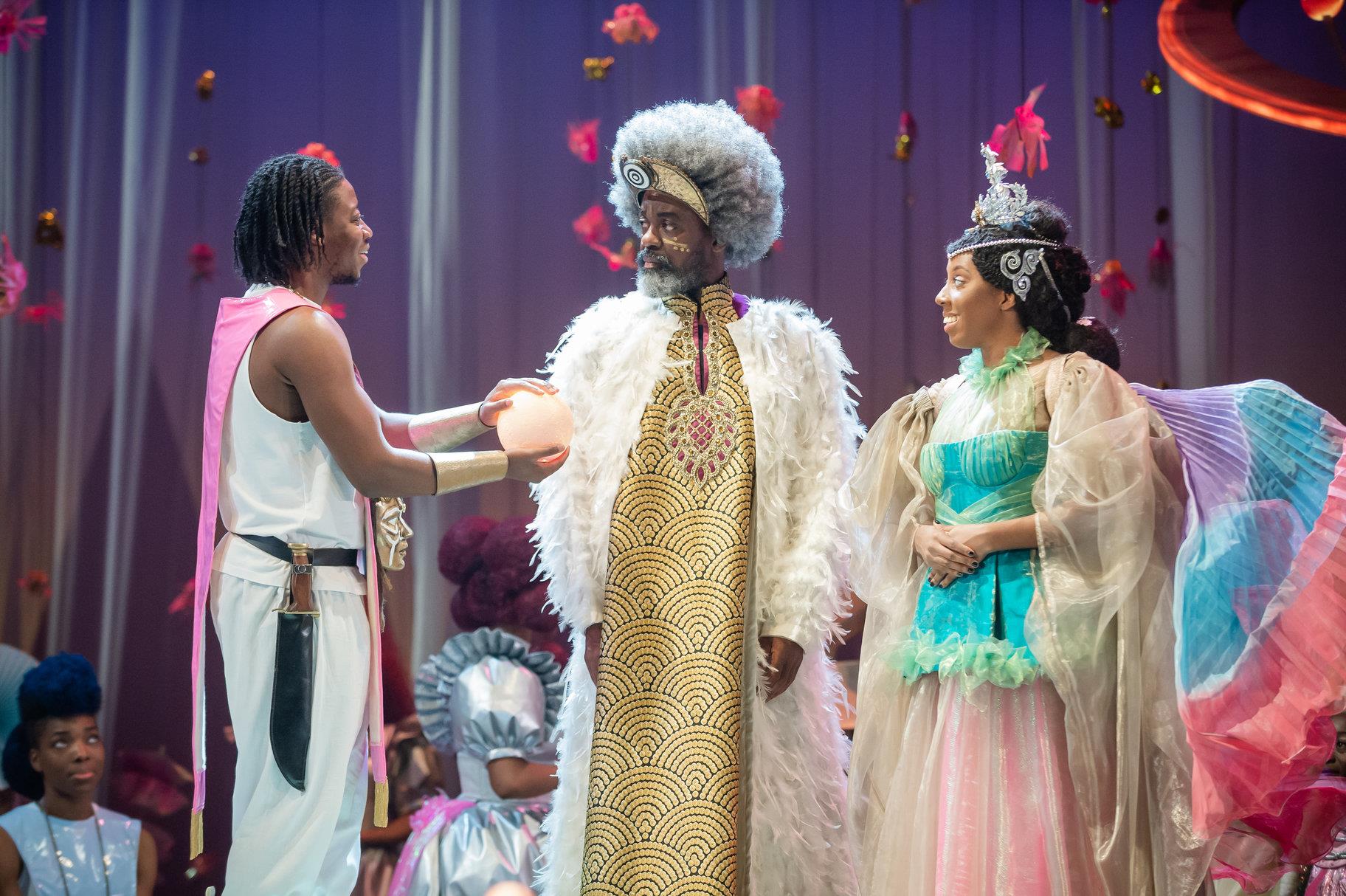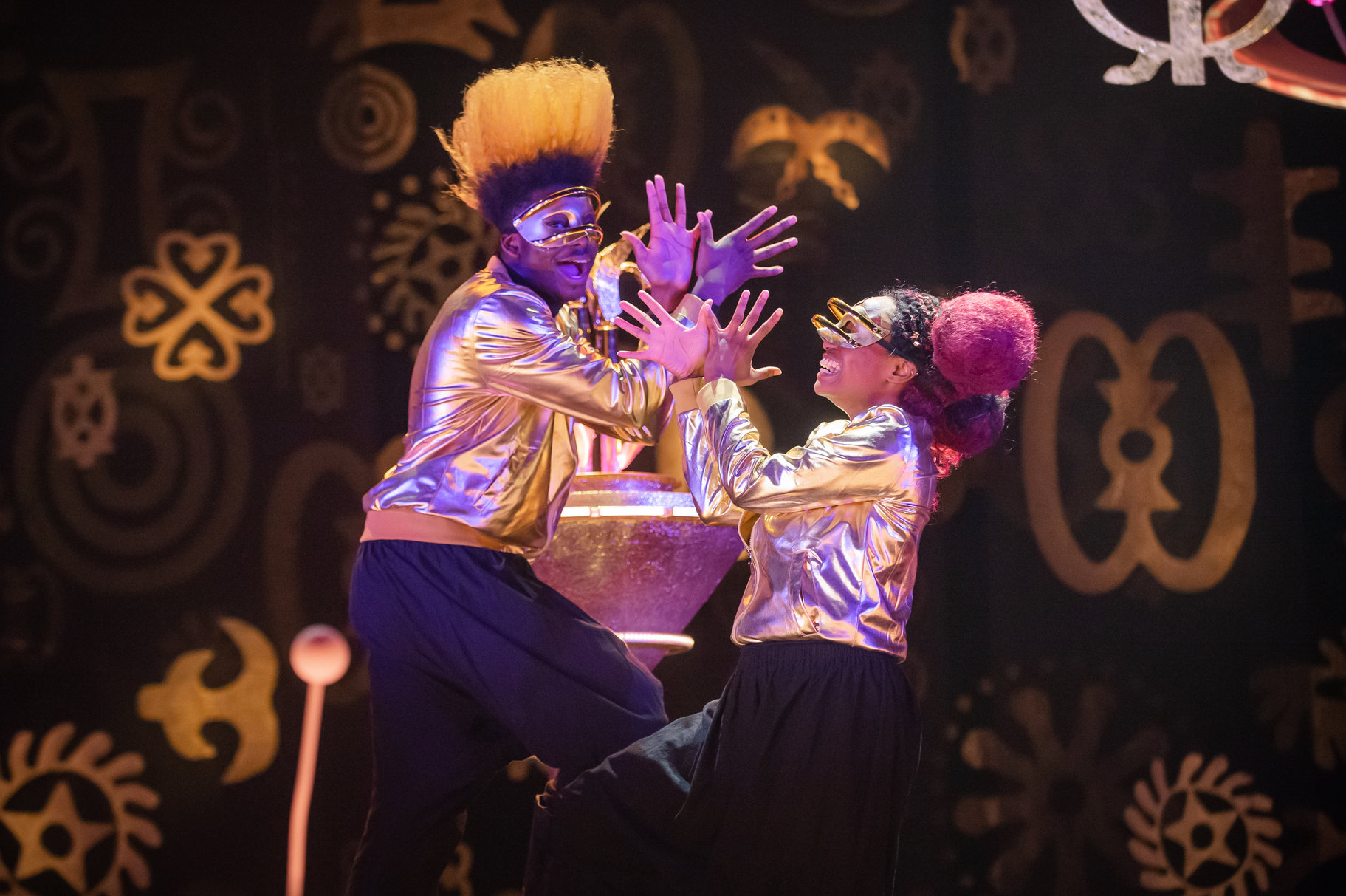 Aruna Jalloh and Adeola YemitanDone wrong, this could look cheap, tacky and ridiculous. But it’s a huge credit to Jemima Robinson’s set and Melissa Simon-Hartman’s costume design that it comes across as innovative, luxurious and aspirational. Imagine going on holiday to this futuristic playground – you’d be on a permanent high! Femi Temowo’s accompanying music is cleverly pitched, near-outrageous, and frequently off-putting; a kind of louche jazz that suggests a whole new notational language of music that we don’t recognise yet. You’d expect magic mushrooms in the saxophone and amphetamines in the keyboard, and it’s simply, thoroughly, delightfully and disconcertingly weird.