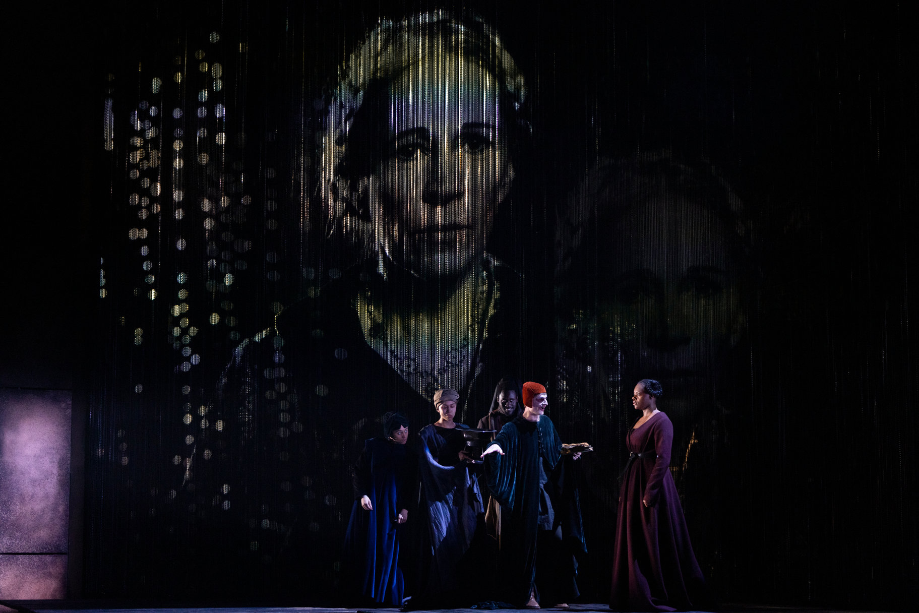Oliver Alvin-Wilson and castBut that’s a matter for later in the summer. Owen Horsley’s magnificent double-production is slick, smart, haunting, and riveting. The biggest design idea, for want of a better word, is to have a roaming camera that creates a huge projection on the backdrop that closes in on the faces of the protagonists at telling moments. It’s a risky practice, but it works brilliantly, especially if you are seated in the front section of the audience, so you see it head on, as we did for Rebellion. Seated on the side, as we were for Wars of the Roses, the projection is a little harder to make out, and the camera operators on stage are a little more noticeable. Nevertheless, it’s a master stroke. It works particularly well when the camera is on the actors off-stage, such as when it follows Cade and his entourage encircling the building – very conspiratorial and alarming!