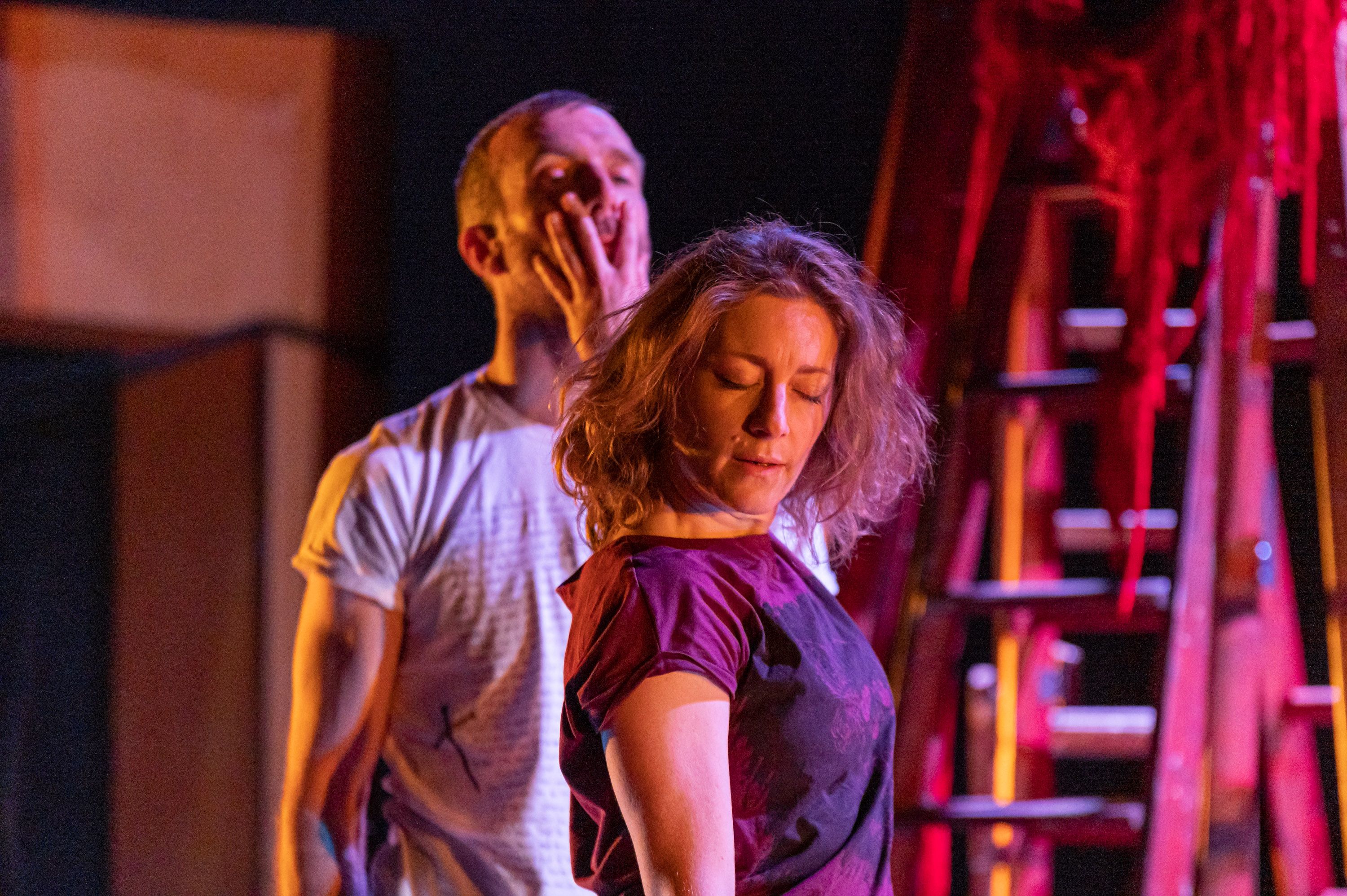 RobApart from playing herself, Jo plays Mary; Rob plays everyone else, from Jesus to Peter to Martha to Lazarus. I’m not a religious person, but there’s always a frisson whenever anyone depicts Christ on stage. One of my most memorable theatre moments was a promenade performance of The Passion at the National Theatre in the late 70s when I found myself standing directly between Mark McManus’ Jesus and Jack Shepherd’s Judas, looking furious at each other. There’s a marvellous transition in The Witness when Rob makes towards the tower and starts to climb the ladder, turns to us and just hangs there – and you realise you’ve witnessed Christ being crucified; that red wool is his blood. And all this time Mary is just arguing with him, remonstrating at his selfishness for leaving her behind. Ne me quitte pas goes the music – don’t leave me – and you physically feel the human element of the separation of Christ and Mary. It’s incredibly moving. At first, I flippantly thought we’d suddenly tuned into Jacques Brel is Alive and Well and Living in Calvary, until I realised its heartfelt appropriateness.