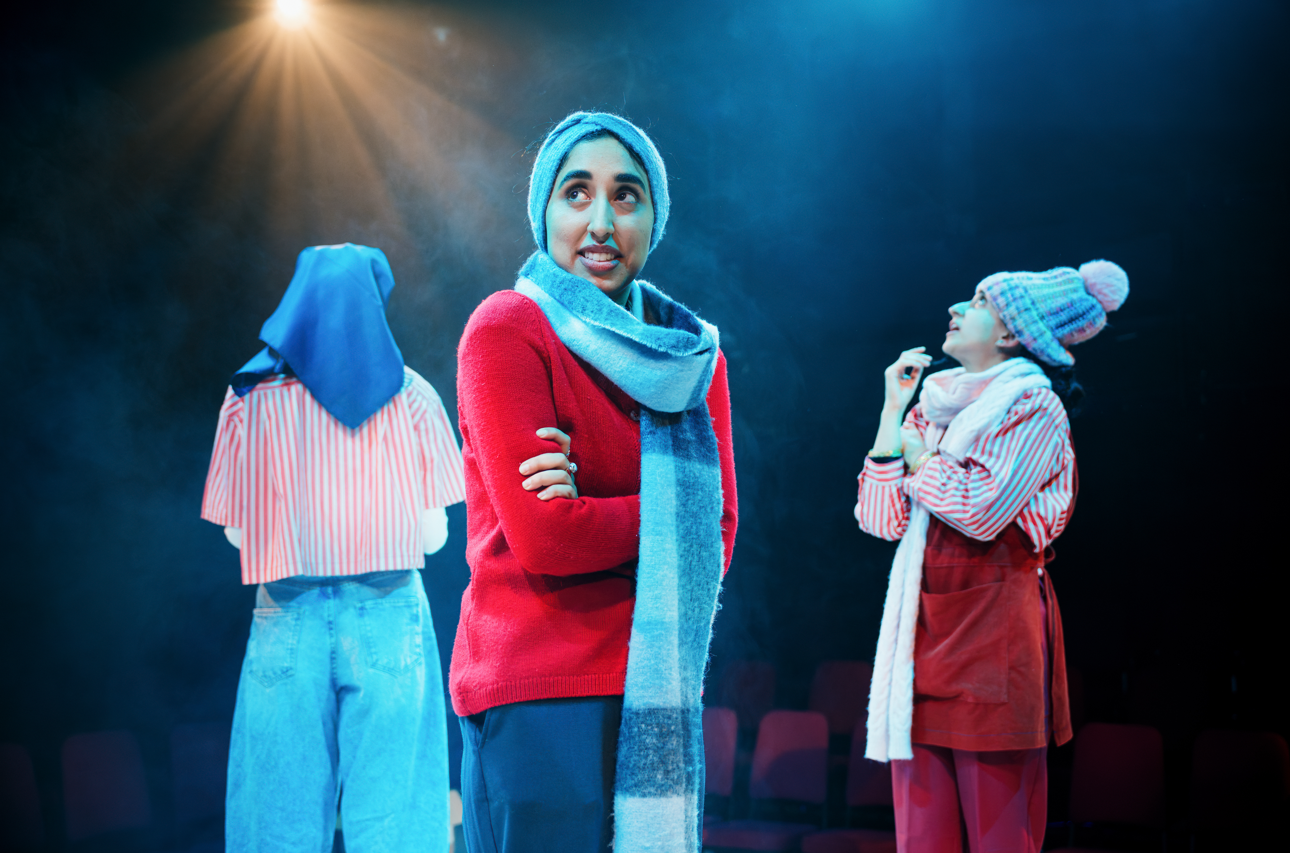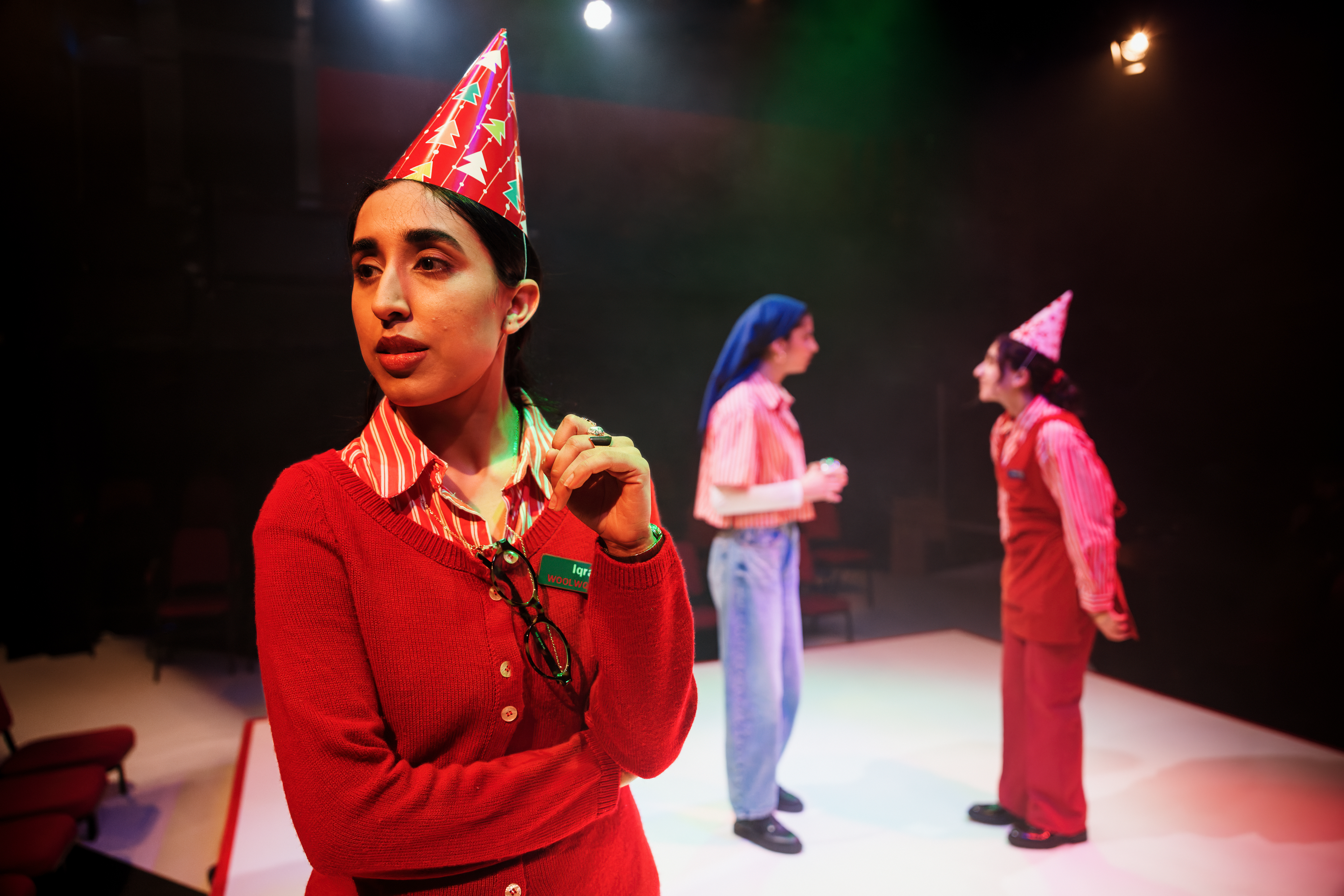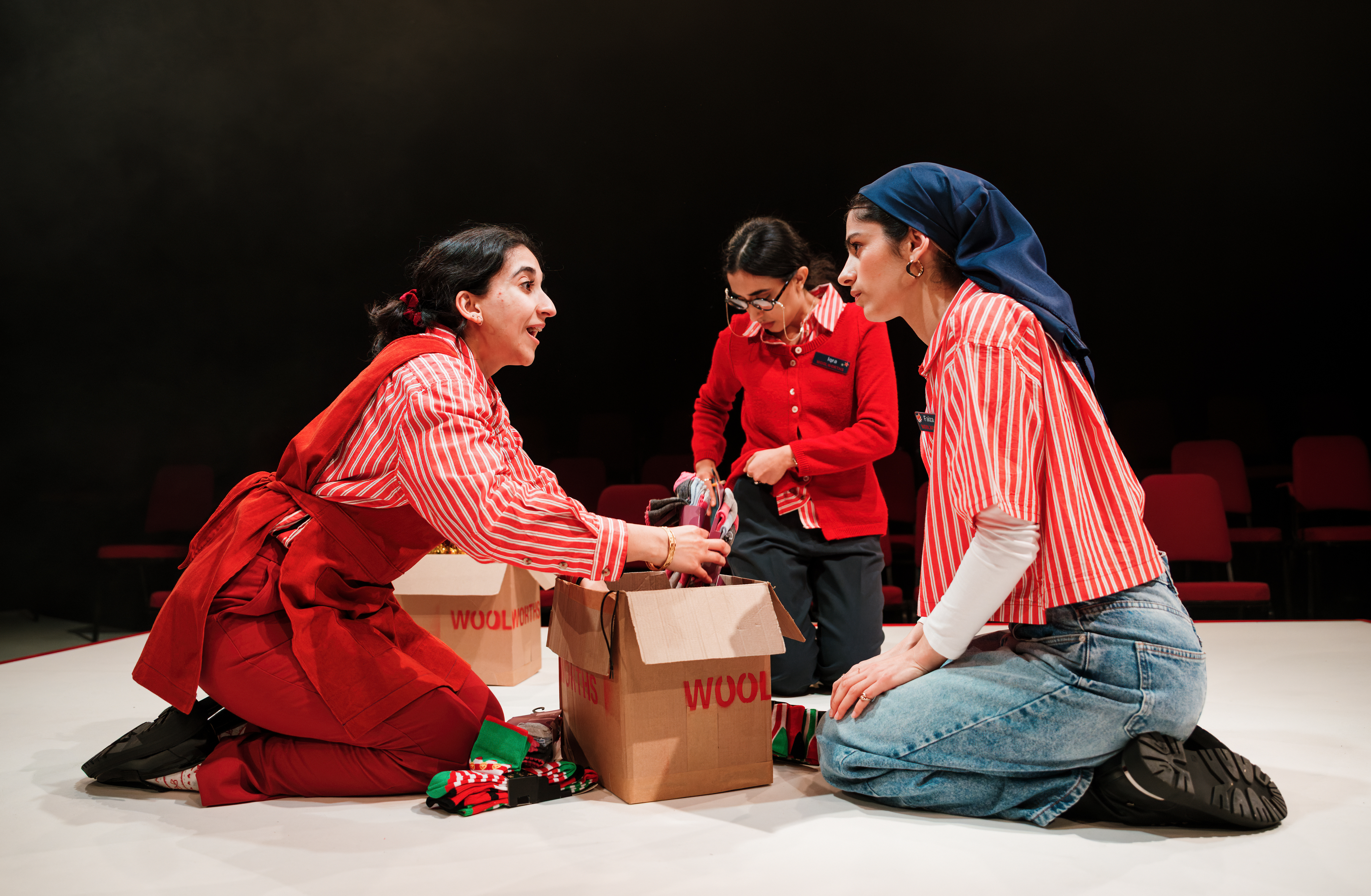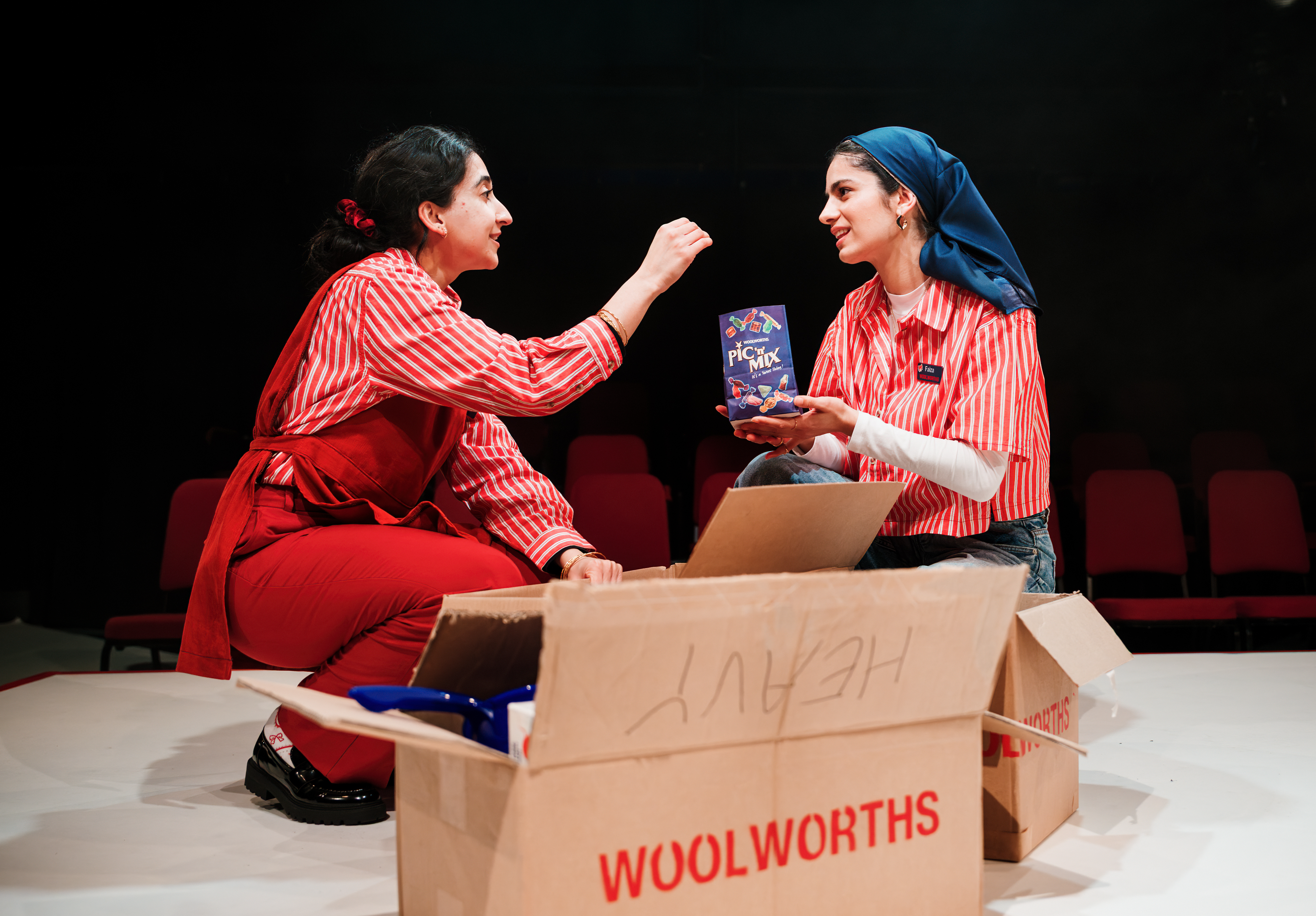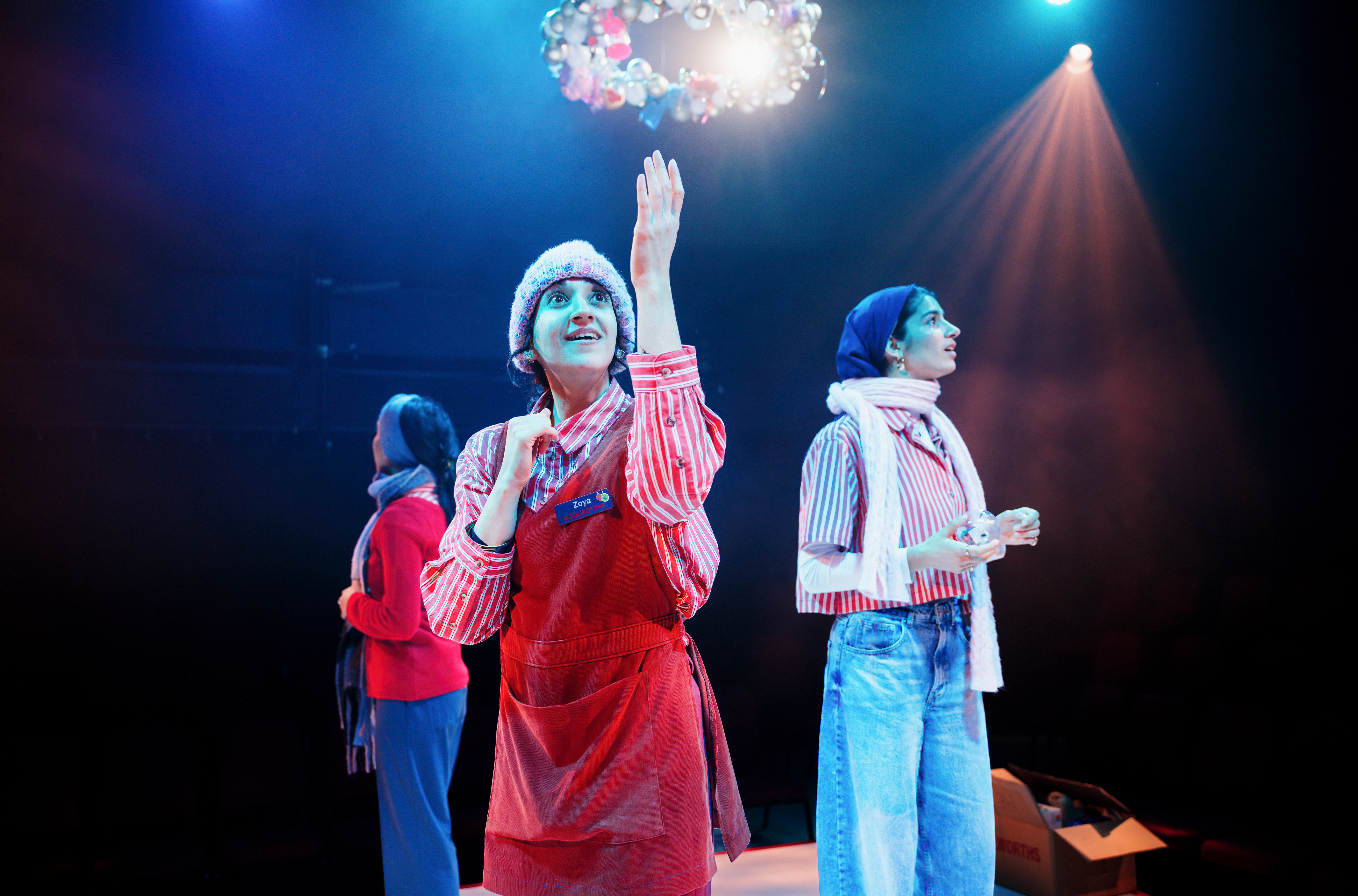 Director Adam Karim stages the play at a lively pace, eliminating all scenery on the Old Fire Station stage in favour of a sequence of higgledy-piggledy cardboard boxes, all proudly bearing the Woolworths name, filled with toys, sweets, Christmas socks, you name it. There’s some mischievous fun had with members of the audience, with the gentleman seated in front of me being chosen as Mr Edwards, Woolworths branch manager, other audience members looking after the pic’n’mix, and even one person dressing up as a snowman. And, of course, Zoya and Iqra welcome everyone as they arrive before the show starts, wishing them Happy Christmas, complimenting them on their party outfits and so on, getting everyone in a relaxed and entertained mood – all beautifully done.