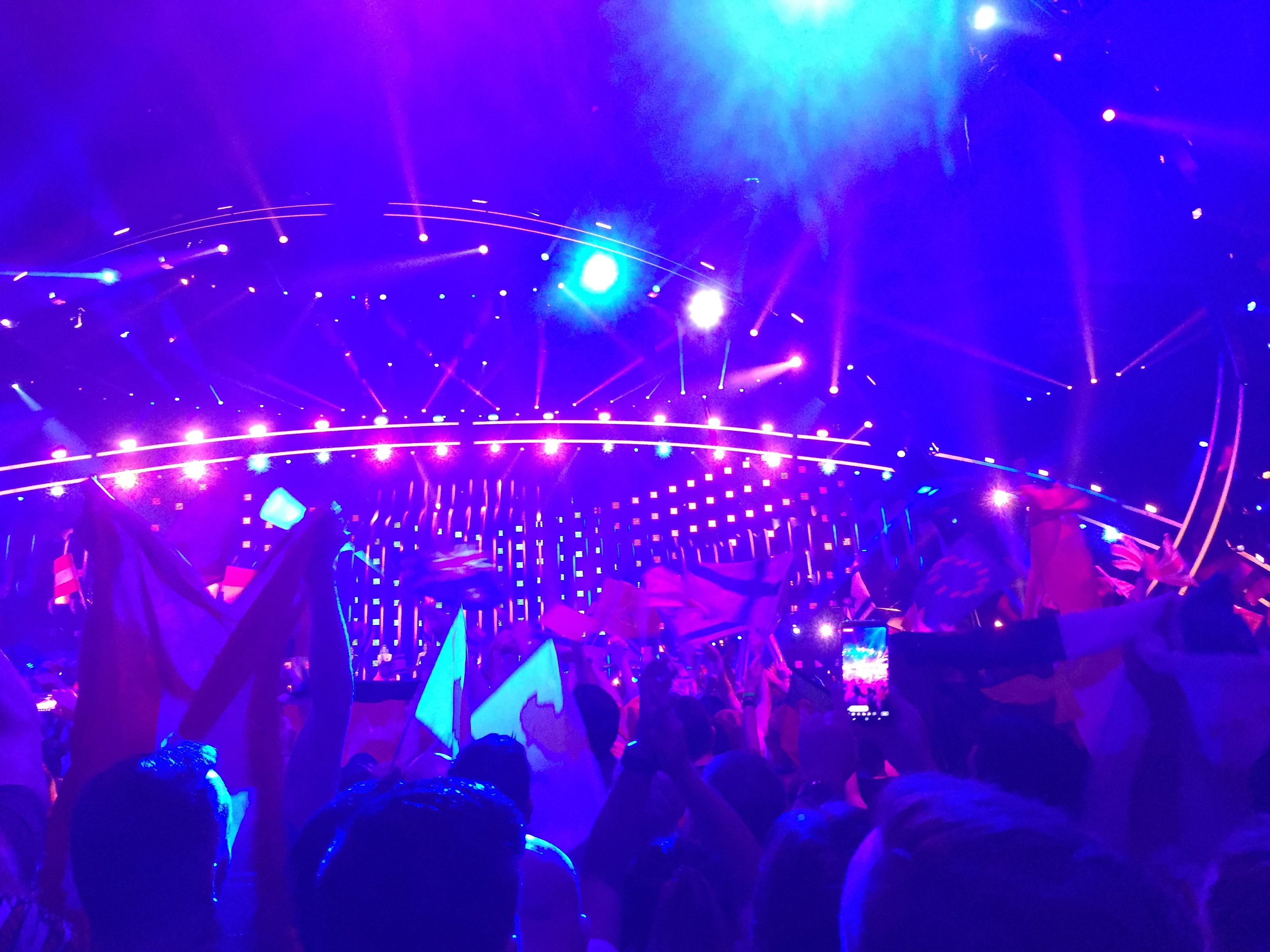 Australia, Greece, Spain and Norway all came, all went and there wasn’t a lot of interest – apart from the one Australian member of the audience who of course HAD to come down to the front whilst Isaiah was on and wave his wallaby at us. Then it was the UK – and we are of course pre-programmed to hope and expect the best and demand that the rest of Europe will respectfully acknowledge our national superiority and festoon us with high scores. Lucie, as we knew she would, performed brilliantly; I think she heightened expectation by having perfected a superb delivery of that song which made us all forget that the song itself is, basically, quite forgettable; and clearly that’s what the majority of the televoters thought too. Not so bad from the juries though, and it’s always a shame to see your country slowly and inexorably drift back to the right hand side of the screen.