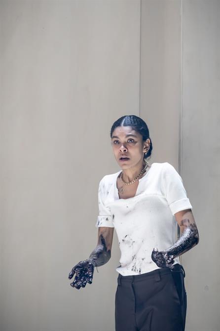 There’s a clue there – red. So why is the blood in this production black? And it’s not blood-like but a thick gooey gunge that gets on everyone’s hands and clothes; and, of course, with no weapons, Caesar is basically patted to death by messy hands, making the memorable “unkindest cut of all” reference redundant. It’s as though everyone is smeared with molasses; maybe Caesar was diabetic and was killed by a high blood sugar surge.
