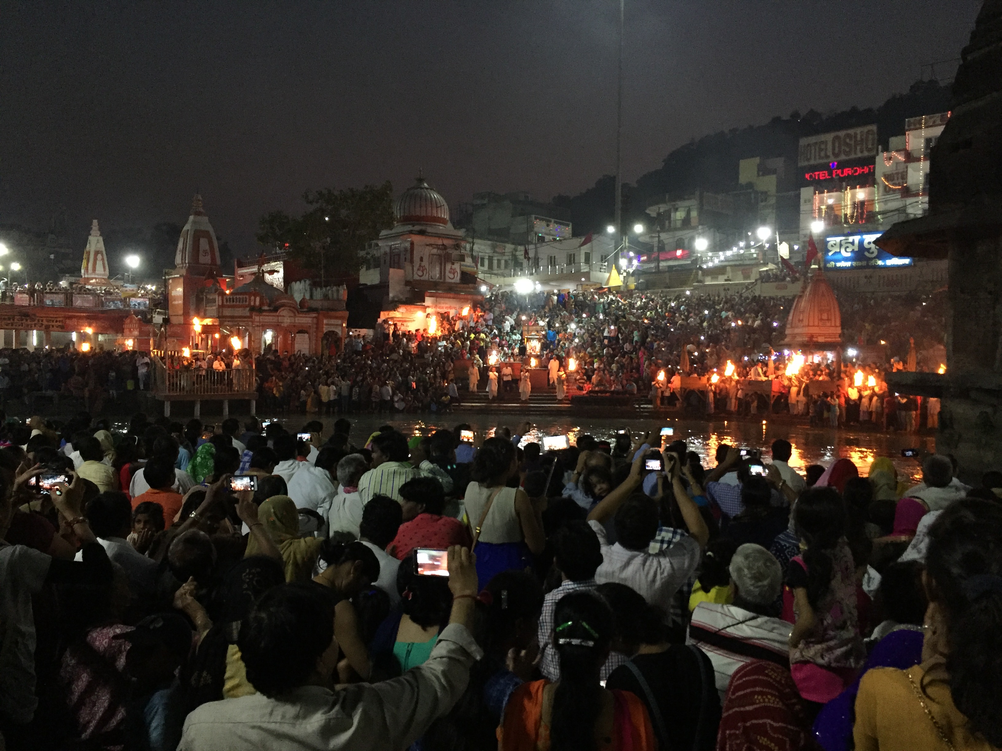 Last year we witnessed the Aarti ceremony in Varanasi, and for scale and sheer showbiz, that one comes top of the game. The ceremony in Haridwar is much smaller; it all takes place on one side of the river bank, and is, as always, an excuse for family outings, picnics, and a general celebration, as well as a holy experience – although you get the feeling that the ceremony itself is nothing like as holy an experience as simply dipping into the Ganges. Eleven priests were involved; a lot of preliminary introductions which finalised in a series of chants to which the crowd replied, and, as it got darker, the priests performed with fire,