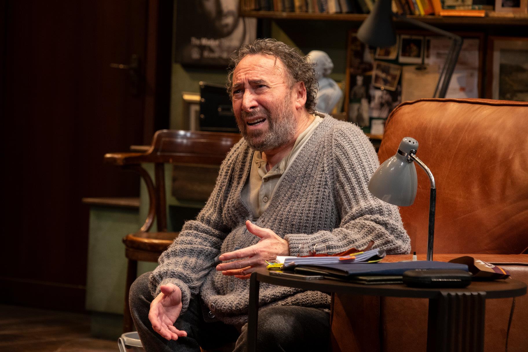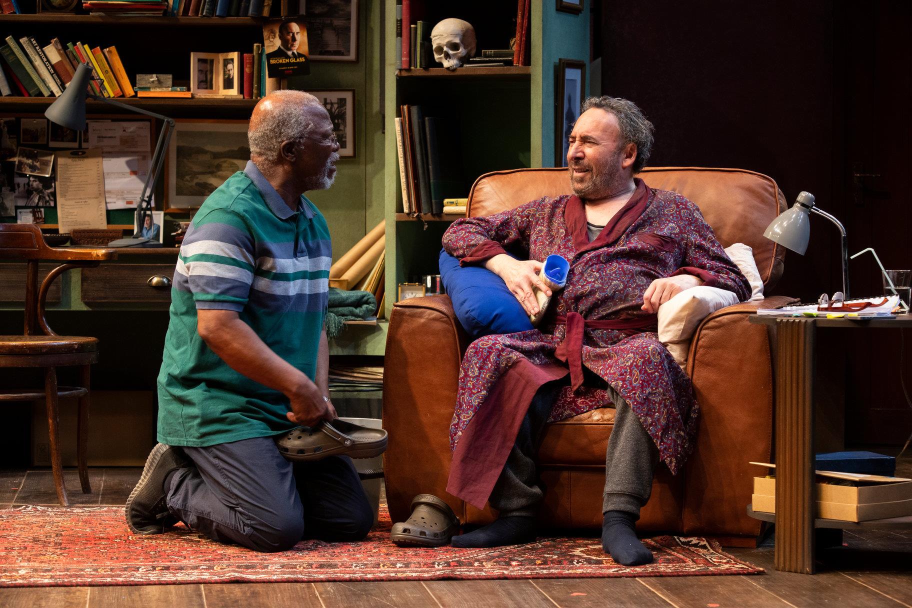 Janice Honeyman’s production for the RSC and Cape Town’s Fugard Theatre is an engrossing, vivid, and honest (sometimes brutally so) insight into the world of these two disparate men and the search for the common humanity that must link them. Birrie le Roux’s two-part set portrays both the cluttered, egotistical, bookish home of the actor, no longer able to take care of himself; and the simple, clean dignity of the nurse’s kitchen, making the best of sixty-year-old furniture, with just his football team’s scarf as a decorative note.