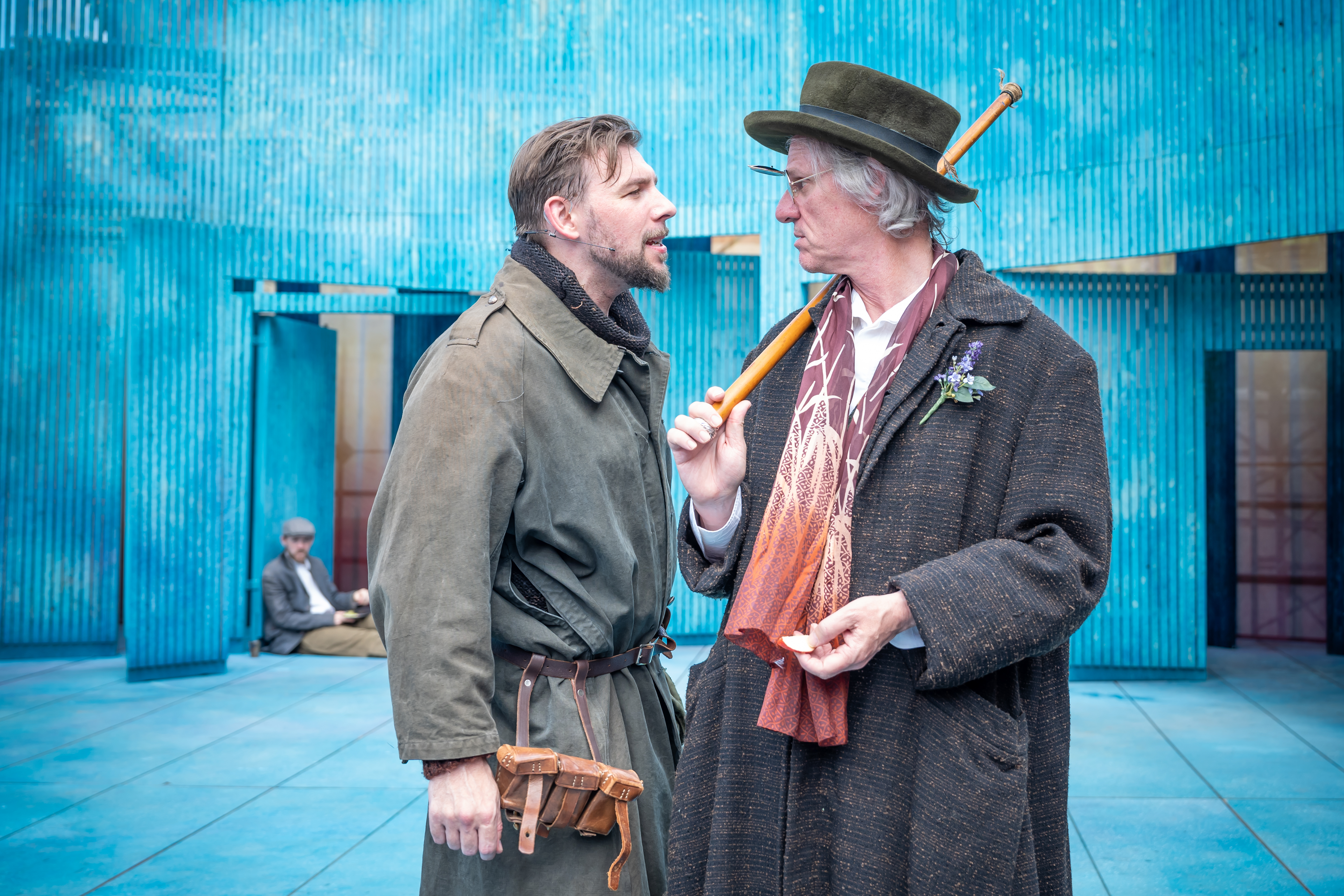 CompanyThe perfect outdoors play? Yes, because apart from a few introductory scenes in Duke Frederick’s Court, it all takes place in the Forest of Arden, a mere hop skip and a jump from Stratford-upon-Avon; although I’m not sure lionesses ever roamed Sheep Street as they do in this particular Forest. But the play is awash with woodland glades, notes pinned on trees, shepherds and shepherdesses, and exiled gentry living the country life as best they can. Odd, perhaps, then, that Liam Bunster’s set doesn’t give one nod to greenery or flora, but instead is a rather sterile blue wooden affair that looks more like a packing crate than a grassy nook. In fact, there’s no “scenery” as such, nor indeed “furniture” anywhere to be seen – so at least that allows us the audience to use our imagination to create our own personal Ardens.