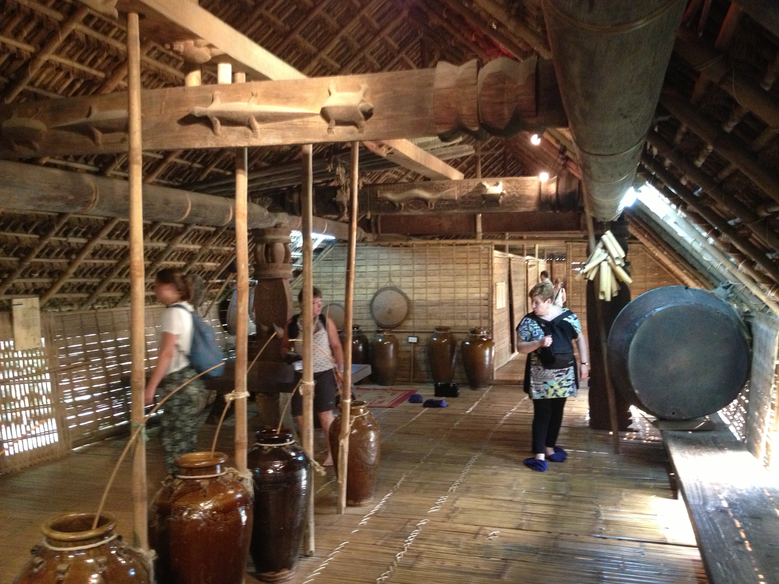 Museum of EthnologyAfter lunch we visited the Museum of Ethnology. This is a great way to discover more about Vietnam’s 54 different ethnic minority groups, and the museum houses a collection of clothes, textiles, musical instruments and many other items of daily life. Outside, in the grounds, are a number of typical buildings that would be used as houses or other meeting areas by different ethnic groups. Mainly thatched roofs were on display, Interesting decorationsmany were on stilts, and one – which was meant to be a sign of good reproductive fortune – had several wooden carvings of men with erections decorating its picket fence. Whilst we were there a group of young people from Koto were also visiting – it looked like they were having a celebratory day out as they were all bedecked with badges and certificates, and were having a whale of a time.