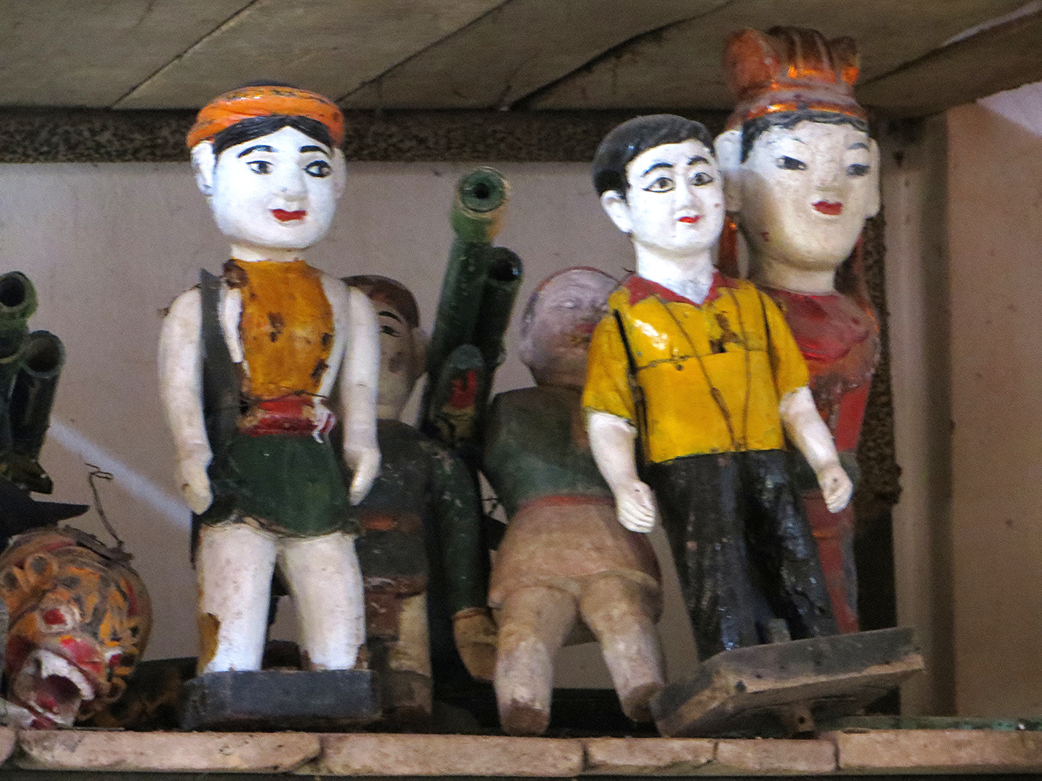 sat on benches opposite to watch the show. A kind of wide, green vertical blind masks us from the puppeteers working behind. The puppets are made of water-resistant wood and are fixed to the ends of long rods which move about underwater thereby making the puppet appear to act on the water surface, which becomes the stage. I would imagine you would have to be extremely strong to operate some of these puppets. All in all, it’s a very charming experience.