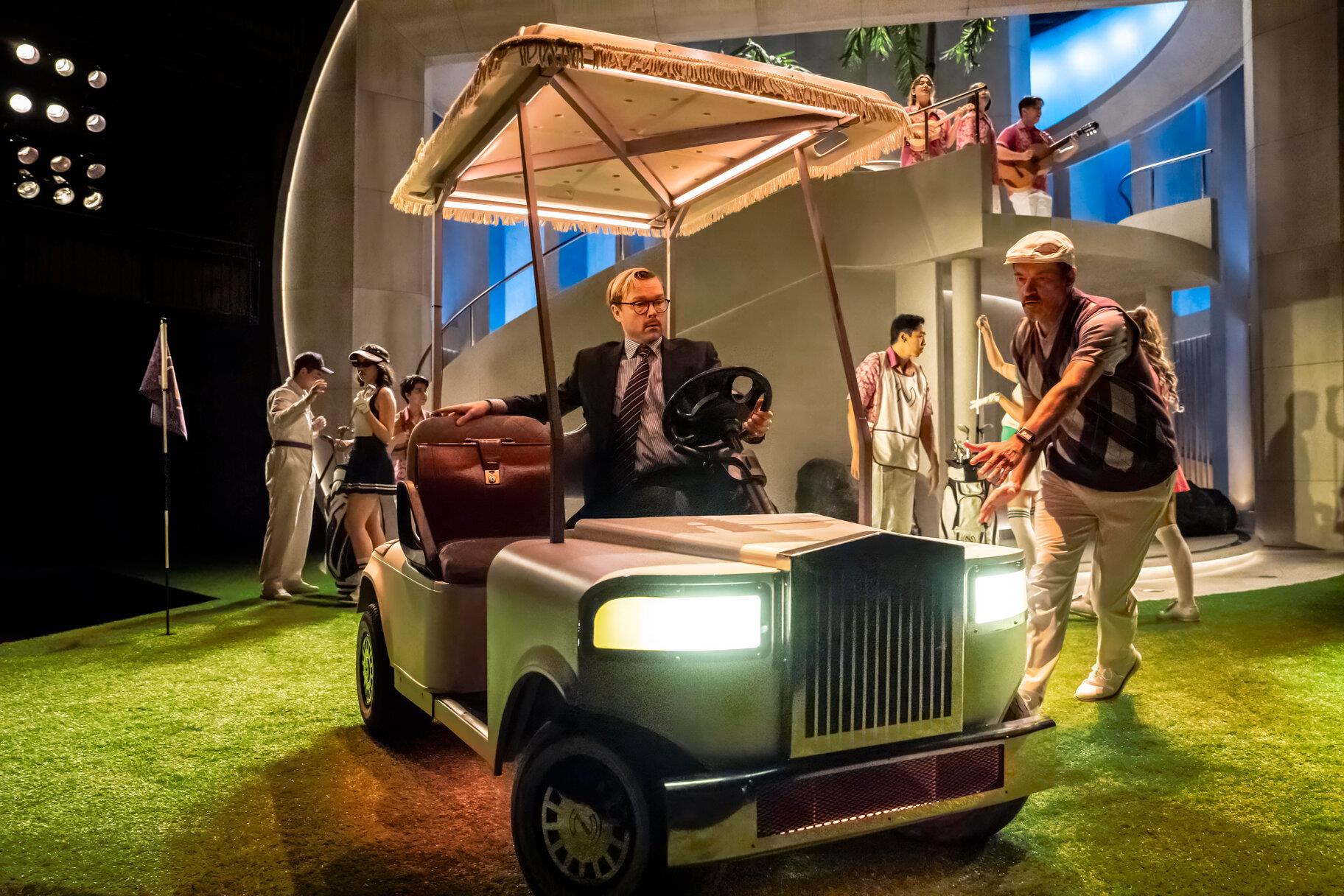 When you arrive in the auditorium you are greeted by Joanna Scotcher’s magnificent set; starting off as some Pacific equivalent of an Oval Office, then transferring to the court of Navarre, a gorgeous revolving set that affords maximum comic potential with places to hide, a fabulous staircase to skip down, and one of those touristy word sculptures spelling out NAVARRE as the perfect location to pose for Your Socials. It’s all fronted by a grassy lawn on which the exclusive clientele of the Navarre Spa can recline and enjoy sunny massages. It reminded me of a very up-market version of the Mamma Mia! set. Does Your Mother Know that you’re out in Polynesia?