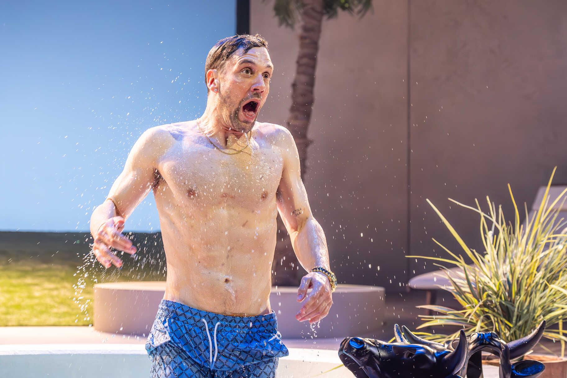 Jon Bausor’s set is nothing if not arresting; the pool in the middle of the stage acts as the bath in the footballers’ changing room, as well as the centrepiece of Leonato’s garden – although a laborious entry by two backstage technicians adding a fountain to it during a scene is clumsy and distracting and adds very little to the effect. Upstairs opens to reveal Hero’s bedroom, although the angle from the stalls doesn’t always make it clear what’s happening up there. However, the football and social media imagery work extremely well thanks to Tal Rosner’s excellent video design.