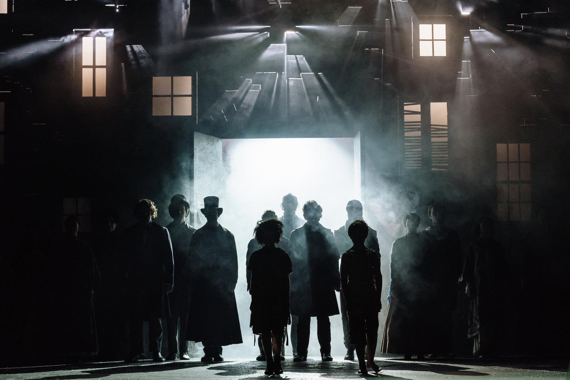 Party Time was written and produced in 1991 and presents a party (no surprises there) where people share suggestions, concerns, prejudices, memories; much like any other party really, but there’s an ever-increasing threat outside which we never fully comprehend, but which bursts on stage and disrupts the charming scene right at the end. Jamie Lloyd has created a very stylised production, where all the partygoers are sitting bolt upright, facing us, in semi-darkness, and they step forward and perform in a small space at the front of the stagewhenever we’re overhearing their part of the ongoing conversation. This creates a much less cosy party environment, and a sense that these characters are on display, being judged. It accentuates their individual isolation, as they remain motionlessly unconnected with those speaking unless they’re part of the same conversation; and Mr Lloyd hasn’t positioned couples together, which makes it even more disconcerting.