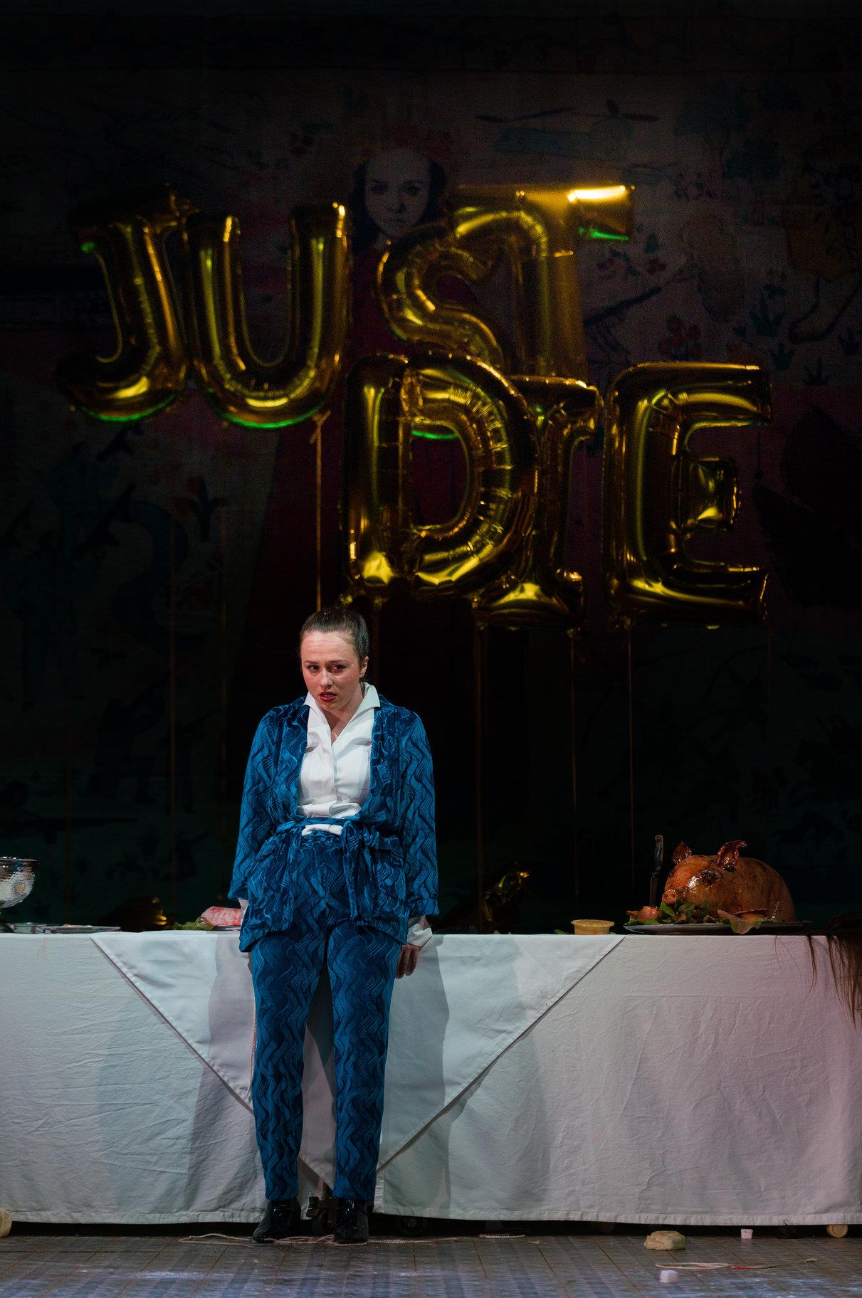Among the lesser characters I really enjoyed the performance by Simon Coates as Lafew, the old courtier who’s seen it all and naturally gets the better of a jumped-up little chappie like Parolles in a series of truly hilarious vocal skirmishes. I also loved Eloise Secker as the Younger Dumain, for whom the pricking of pomposity comes as a fine art. Perhaps best of all, Jamie Wilkes’ Parolles is a wonderful comic creation; if ever the phrase all mouth and trousers was designed to fit anyone, it would be this fellow. Mr Wilkes gives us some terrific breaking the fourth wall moments, full of braggadocio for anyone who will stop still and listen until he’s captured and becomes the biggest Squealer since Animal Farm. It’s a brilliant performance, hugely entertaining; he makes you wonder why All’s Well That Ends Well doesn’t get performed more.