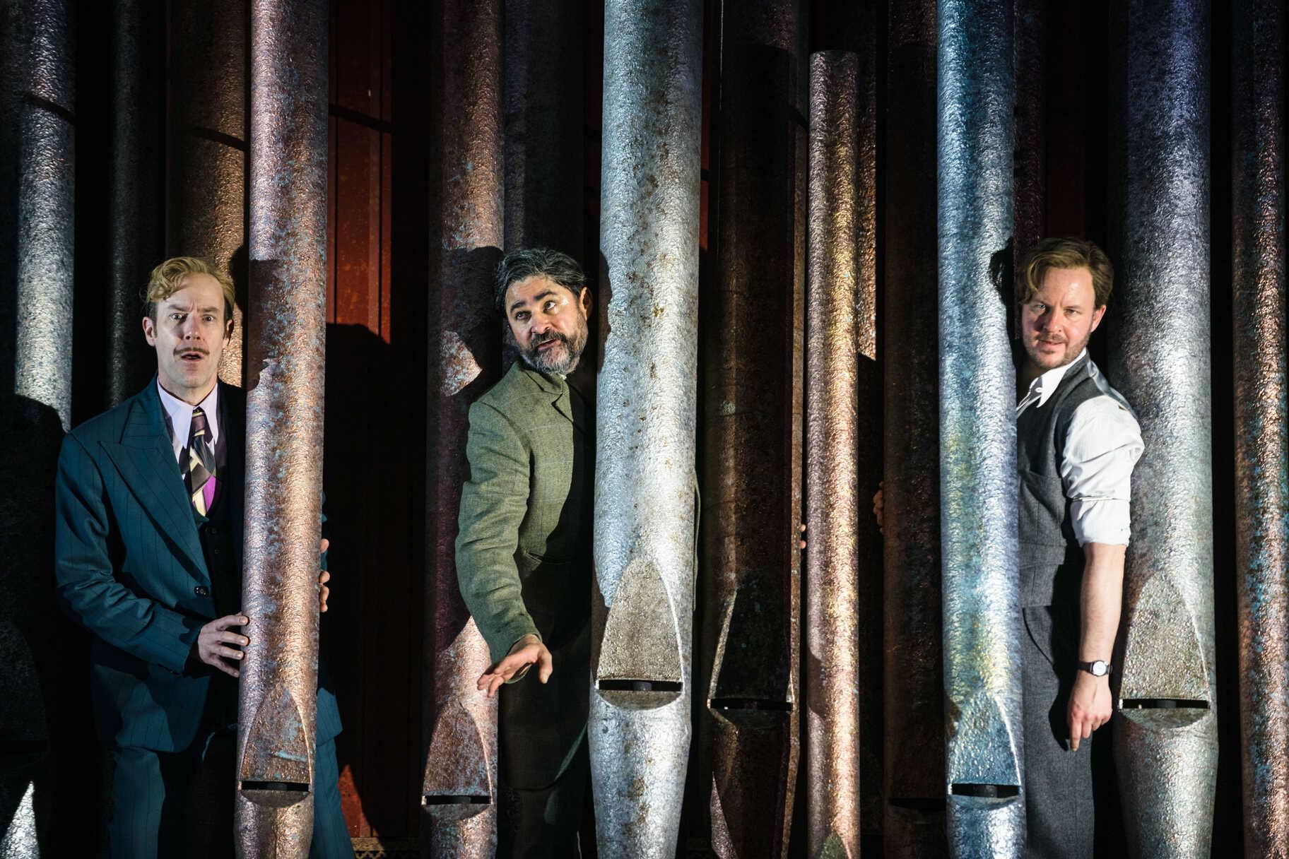 And I haven’t mentioned the set; dominated, for the most part, by an enormous organ, with pipes so big you can hide behind, magically controlled by Feste seemingly bringing it forward and back with the power of his own summoning arms. It also provides the perfect joke when Orsino and his men arrive at Olivia’s house bearing the gift of an organ; their shock at the size of the one already installed requires their measly offering to be shunted unceremoniously offstage in embarrassment. You’ve never seen Organ Envy like it.