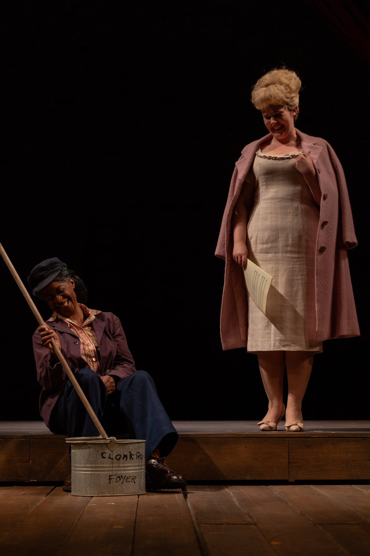 Amanda Hadingue is superb throughout, with her wonderfully arty avant-garde art teacher Nick, the dandy Victor Spinetti and other roles, including Joan 6. Emily Johnstone’s turn as Barbara Windsor is beautifully judged, suggesting the much-loved Babs without being an impersonation – and it works really well. There are excellent performances too from Aretha Ayeh as Joan 3 (her young challenging phase), Tam Williams as Howard Goorney and a delightfully soft-spoken Murray Melvin, Greg Barnett as the charismatic Jimmie Miller and Daisy Badger as the haranguing and harangued Rosalie. Best of all, the fabulous Sophie Nomvete steals every scene as the hard-working and inspirational Joan 4, and the “posh northern” Avis Bunnage – although they did play that open-voweled joke to death. Ms Nomvete broke our hearts as Sofia in The Color Purple and in Miss Littlewood she spreads joy with every breath she takes.